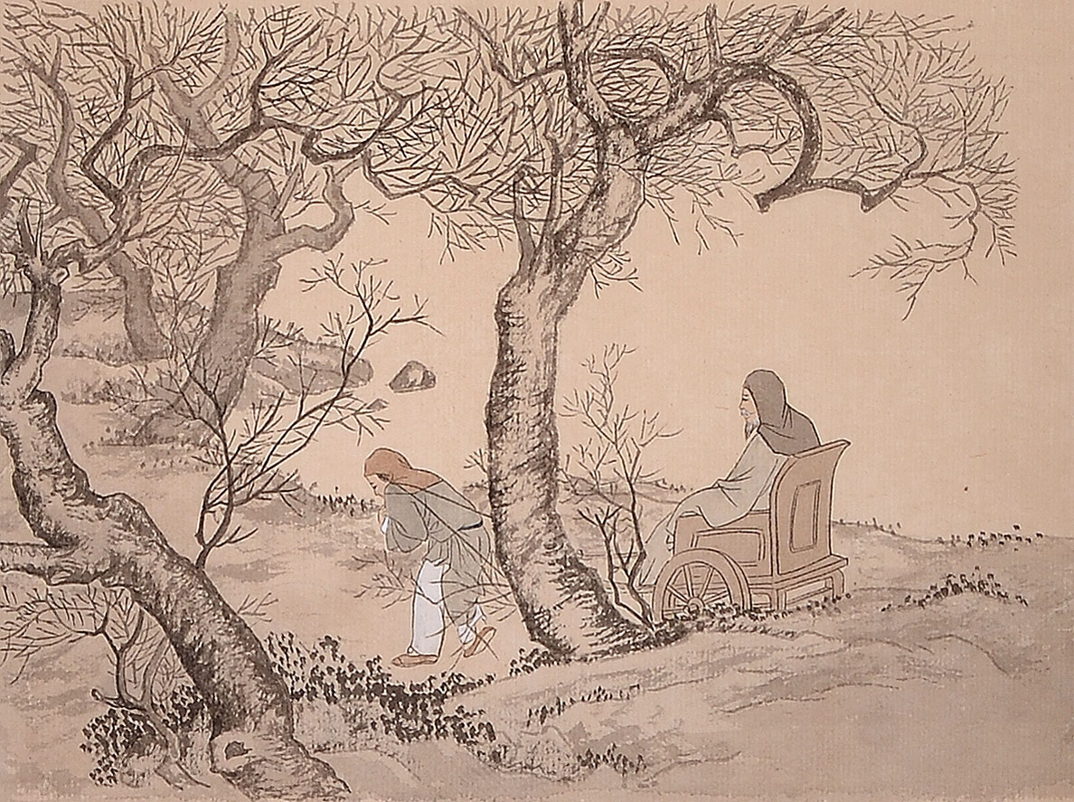 译文:周朝时有个老人叫莱子,非常孝顺。他伺候二老双亲,总是极尽所能地做可口的甘美的食物。他的年龄马上就七十了(古稀之年,在当时是极其少见 的),从来不在父母面前说老子。他经常身穿色彩鲜艳的婴儿装,象婴儿一样在双亲身边戏昵。有一次曾经在为老人端洗脚水时,故意假装跌倒,趴在地上,学小婴 儿的哇哇哭声,逗老人开心。